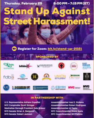 It’s time to “Stand Up Against #StreetHarassment.” On Thursday, 2/25 at 6 PM ET, we’re joining @GNYLinks, @ihollagram, @NYUMcSilver and many other co-sponsors and partners for a virtual forum on how to safely handle harassment in public spaces. RSVP at bit.ly/stand-up-2021